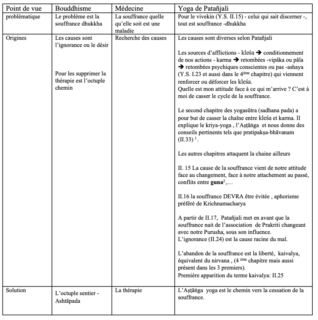 On peut s’aventurer à établir un tableau comparatif entre  yoga et bouddhisme en y incluant la médecine allopathique
