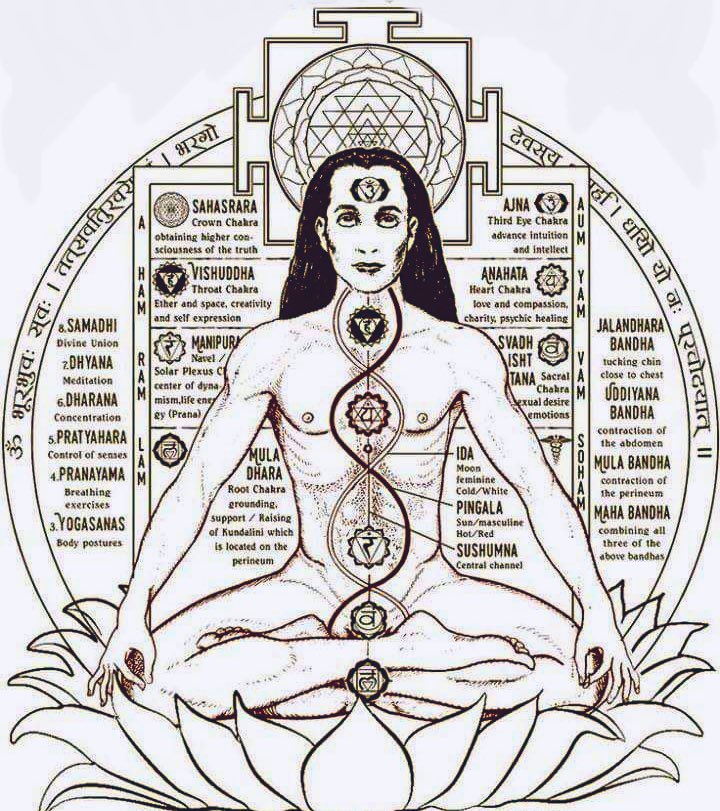 Après, on retrouve des références aux corps subtils et point énergétiques dans le Yoga Yajnavalkyam[6] et le Yogavāsiṣṭha (ouvrage remarquable composé entre le VIIIe siècle et le XIIIe siècle ap. J.-C). Ces textes font références à ce que l’on appelle actuellement des Câkra, ou nœud psycho-énergétique. Apparaissent aussi la mention à ce qu’on appellera kundalini. Ce terme fait référence à un serpent enroulé dont la bouche vient obturer le nâdi central , ou sushumna. La littérature tantrique fera aussi référence à deux autres canaux  particulièrement importants qui sont ida et pingala : Ida (gauche): considéré comme le canal lunaire, il contrôle les activités du mental. Pingala (droite): considéré comme le canal solaire, il contrôle les activités physiques.